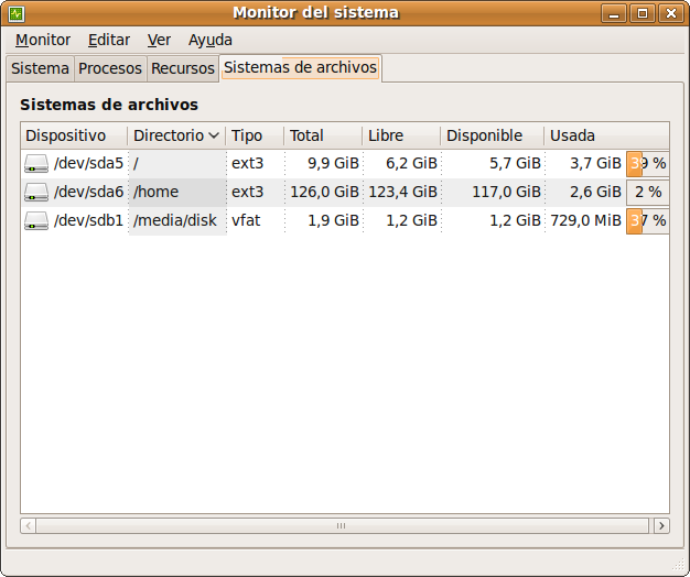 Haga clic en Sistema → Administración → Monitor del sistema y seleccione la pestaña Sistemas de archivos para ver cuánto espacio libre queda en sus discos.
