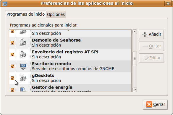 5. Busque ahora la entrada gDesklet en la lista y asegúrese de que la casilla que hay a su izquierda está marcada. Finalmente pulse Cerrar. Si quiere evitar que gDesklets se ejecute al inicio simplemente desmarque esta casilla.