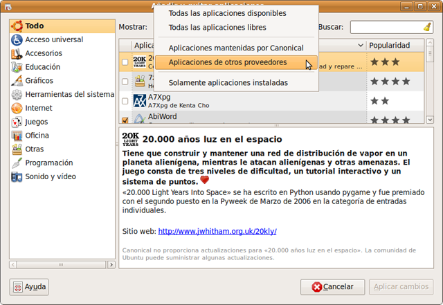 En la lista desplegable Mostrar: seleccione Aplicaciones de otros proveedores