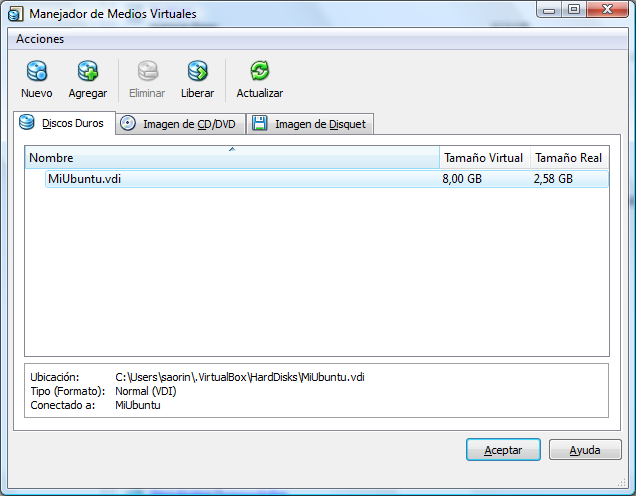 De esta forma hemos quitado la máquina pero no hemos eliminado todavía Ubuntu que como sabemos está ubicado en un disco duro virtual. Así que a continuación vamos al menú Archivos→Administrador de Medios Virtuales