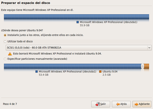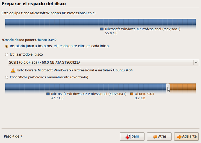 Instalarlo junto a los otros, eligiendo entre ellos en cada inicio. Esta es la opción más común. Es muy frecuente que tengamos ya instalada alguna versión de Windows que está ocupando todo el disco duro. Tenemos entonces que hacer hueco para Ubuntu mediante un proceso que en la jerga se conoce como "redimensionar", esto es, disminuir el espacio que ocupa Windows para que quede un sitio libre. Para ello haga clic con el botón izquierdo del ratón sobre el tirador que hay en la barra gráfica inferior y sin soltar arrastre hacia la izquierda.