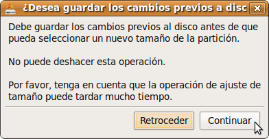 Conforme arrastre el puntero, el gráfico irá mostrando el espacio libre que utilizará Ubuntu. Será necesario un mínimo de 8 GB tal como se comentó. Aunque si planea hacer un uso amplio de Ubuntu es conveniente que libere algo más de espacio. Si intenta arrastrar el puntero del ratón hasta el final verá que hay un momento en que no es posible llevarlo más allá. Este límite está determinado por el espacio real actualmente ocupado por Windows. Aunque es posible hacerlo, no debería reducir el tamaño de Windows hasta ese límite puesto que si va a continuar trabajando con él necesitará que tenga a su disposición algo más de espacio que el actualmente ocupado. Una vez hecho esto pulse "Adelante".