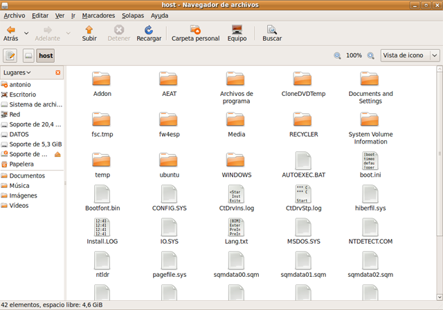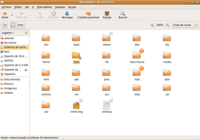Localice la carpeta host y haga doble clic sobre ella. Verá el listado de archivos y carpetas de Windows, (tal como si estuviera accediendo a la unidad C: desde el icono MiPc).