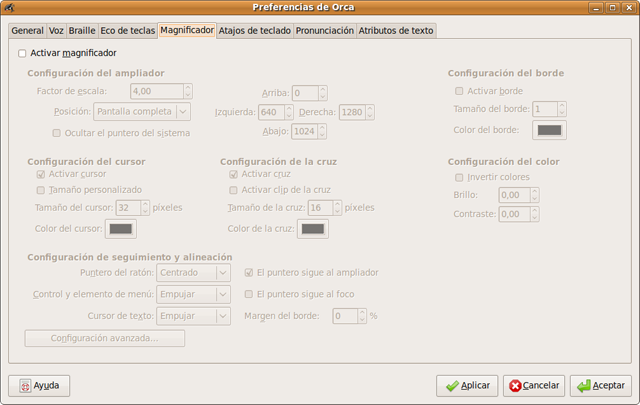 Además de leer la pantalla, Orca incorpora también un magnificador para facilitar la lectura de ciertas áreas de la pantalla a las personas con deficiencias visuales. Este magnificador puede ser configurado para ampliar la pantalla de 1 a 16 veces, ajustar el brillo y el contraste o invertir los colores de la pantalla.