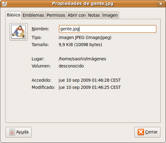 Básico. Nos ofrece información acerca del tipo de archivo, tamaño, ubicación, etc. Además podemos renombrar el elemento.