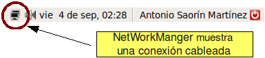 Network Manager es un pequeño icono en el área de notificación del sistema en la parte superior derecha de la pantalla. Tendrá la forma de dos ordenadores superpuestos cuando la conexión sea cableada o cuatro barras escalonadas, grises o azules, cuando se trate de una conexión inalámbrica. Haga clic con el botón izquierdo del ratón sobre ese icono para acceder a las funciones automáticas, tales como conectarse a una red, o con el botón derecho para el control manual y activar o desactivar las conexiones.