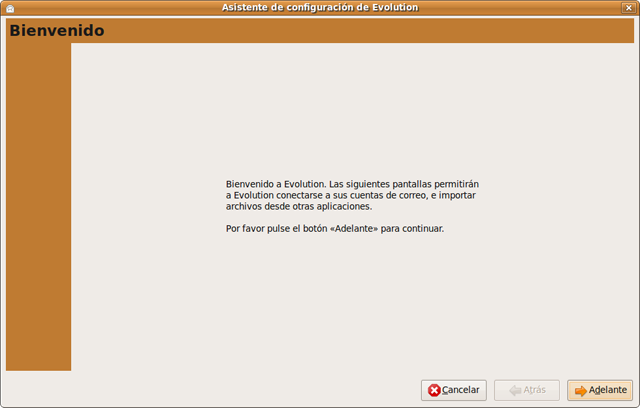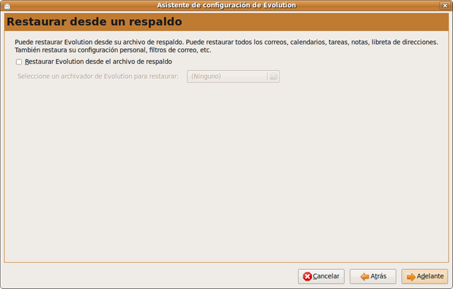 Comienza con una pantalla de bienvenida, donde nos ofrece la posibilidad de recuperar la configuración personal desde una anterior instalación de Evolution, si es ése su caso, bastará con indicar el lugar donde se encuentra el archivo de respaldo, de no ser así, pulsamos Adelante, omitiendo dicha información.
