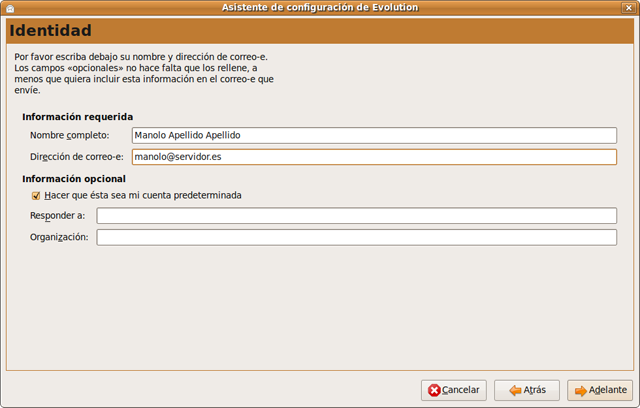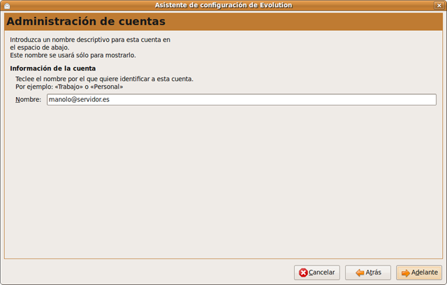 Antes de poder usar Evolution para enviar y recibir correo debemos configurar una cuenta. Para ello necesitaremos tener presentes los datos suministrados por nuestro proveedor. A modo de ejemplo crearemos una cuenta de correo utilizando información ficticia. Cuando usted lo haga deberá introducir los valores reales correspondientes que le haya proporcionado su proveedor de acceso, pero, en la mayoría de las ocasiones presentarán el siguiente formato: