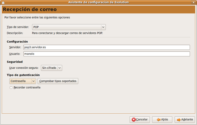 Introduciremos el nombre del equipo que nos proporciona el correo entrante, en nuestro ejemplo, pop3.servidor.es, y el nombre de usuario, manolo, con que se identificará Evolution ante el servidor.