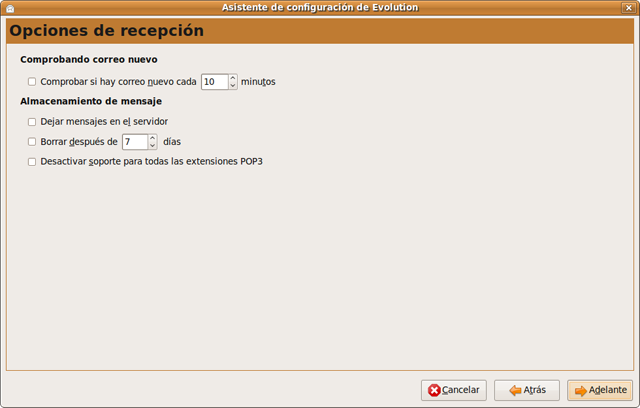 A continuación nos pregunta sobre algunas cuestiones relacionadas con la gestión de nuestro correo entrante suficientemente descriptivas. Sólo apuntar que no es conveniente dejar los mensajes en el servidor pues podríamos rebasar la cuota de buzón que pudiéramos tener asignada, lo que impediría que siguiéramos recibiendo correspondencia.