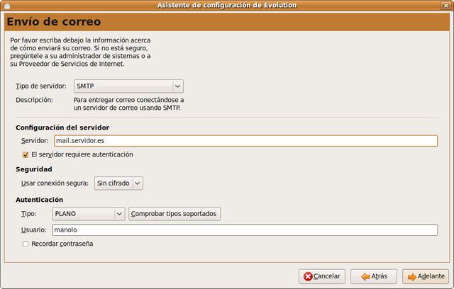 Seguidamente establecemos las condiciones para el envío de correo, en términos parecidos a la recepción. El tipo de servidor será, habitualmente SMTP "Simple Mail Transfer Protocol", salvo que nuestro proveedor nos haya indicado otro tipo distinto. Cumplimentaremos el nombre del ordenador que nos permitirá enviar correo, en nuestro ejemplo mail.servidor.es, y el nombre de usuario, manolo, que suele coincidir con el requerido para la recepción.