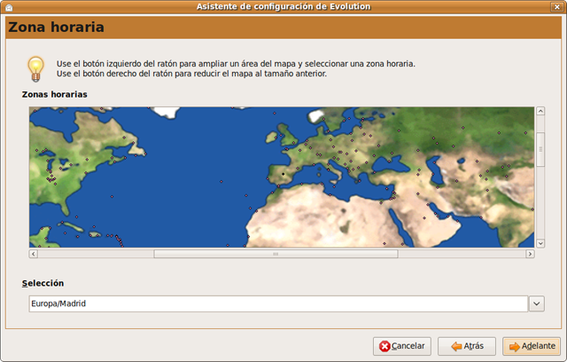 Nos queda por configurar la zona horaria. El asistente tomará automáticamente la del sistema, si no es correcta selecciónela haciendo clic en el mapa sobre Madrid o utilizando la lista desplegable.