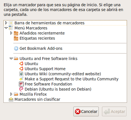 En el campo "Página de inicio" podemos establecer manualmente la dirección, pero si pulsamos cualquiera de los botones situados bajo este campo, obtenemos: