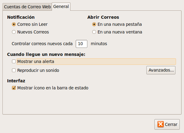 Bajo la pestaña General se encuentra el resto de parámetros de la configuración, con opciones bastante descriptivas sobre el comportamiento de la extensión al controlar nuestro correo web.