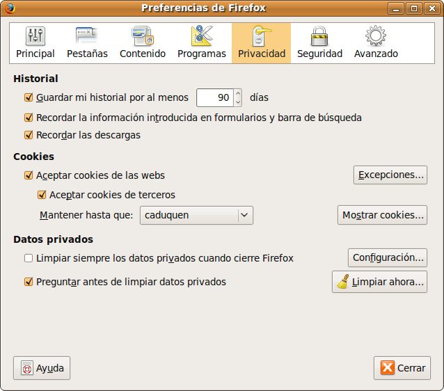 Si hace clic en Limpiar ahora, Firefox "olvidará" todas las páginas visitadas hasta el momento y únicamente conservará vínculos a las incluidas en los marcadores. También puede realizar esta limpieza directamente desde el menú Herramientas -> Limpiar datos privados, o mediante la combinación Ctrl + Mayúsc. + Supr.