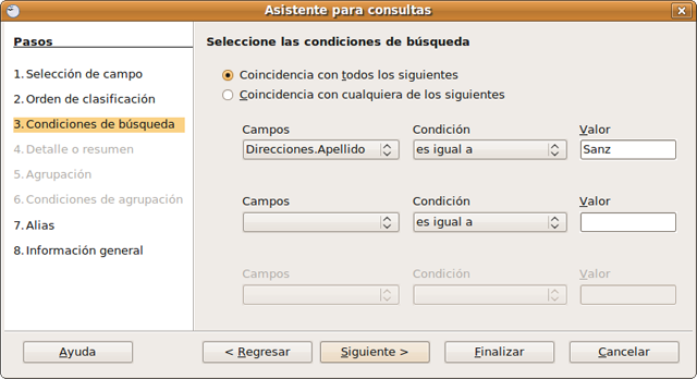 Condiciones de búsqueda. Especificamos los campos y condiciones que han de servir para realizar el filtrado de la base de datos. De no imponer ninguna, se mostrarán todos los registros agrupados según le indiquemos al asistente.