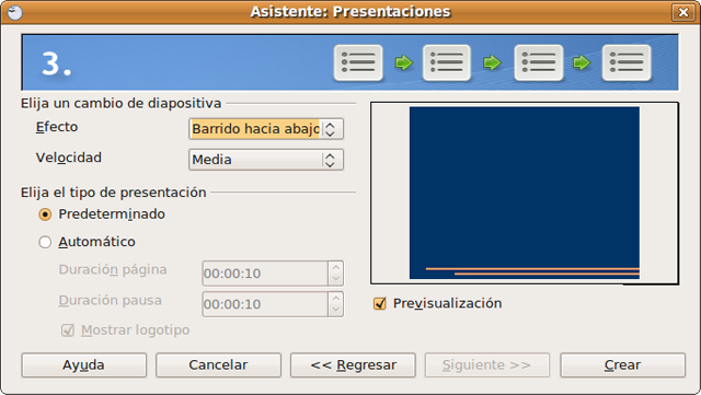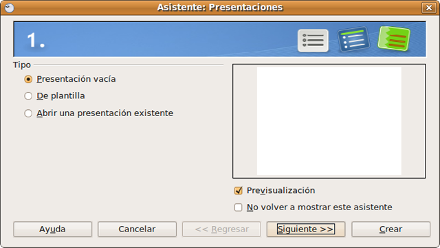 Si decidimos utilizar el asistente, estableceremos el fondo y el medio de la diapositiva ayudados por la previsualización que se muestra en la parte derecha de la pantalla. O bien basaremos nuestra presentación en una de las plantillas existentes.
