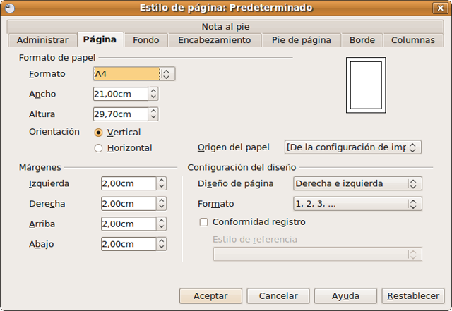 Formato: En la lista desplegable encontramos los tamaños de papel estandarizados más comunes. Habitualmente seleccionaremos A4 que es el más utilizado en los documentos sencillos.