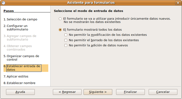 Establecer entrada de datos. Desde aquí especificaremos el modo como se controlará la entrada de datos para el formulario. Es en sí mismo bastante explicativo.