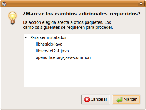 Marcamos para instalar openoffice.org-base y una ventana informativa nos indica que debemos instalar tres paquetes adicionales. Pulsamos el botón Marcar.
