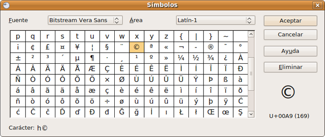 Con el teclado introduciremos los caracteres más habituales pero si quiere insertar algún símbolo especial, como el de copyright o una letra griega, utilice el menú Insertar -> Símbolos. Haga clic en el símbolo deseado y pulse Aceptar.