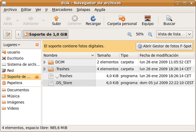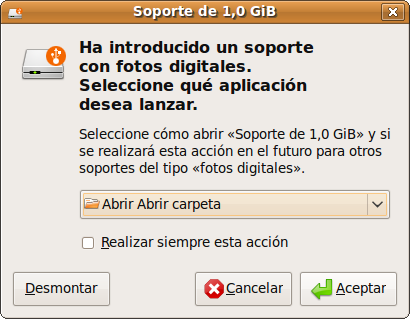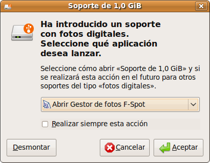 Observando con atención la ventana emergente, el icono que nos sugiere ahora es el de un disco, a diferencia del caso anterior en que se trataba de una cámara digital. En este caso, al pulsar sobre Aceptar, será el propio F-Spot quien recuperará las imágenes contenidas en la tarjeta.