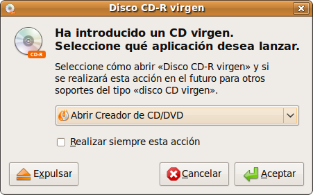 Cuando inserte un CD virgen en la grabadora, Ubuntu le preguntará si desea grabarlo utilizando la aplicación Creador de CD/DVD.