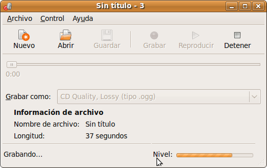Puede grabar sonidos si tiene conectado a su equipo un micrófono o cualquier otro dispositivo de grabación. Ubuntu viene con una aplicación simple de grabación de sonido, para ejecutarla vaya al menú Aplicaciones → Sonido y Vídeo → Grabador de sonido