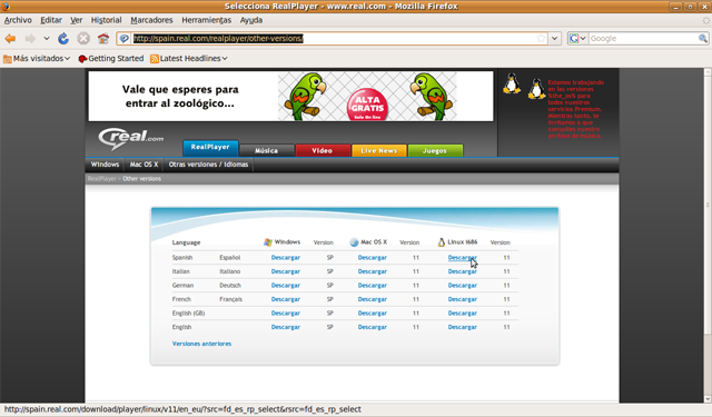 1. Descargue un instalador para Linux desde el sitio de RealPlayer y guárdelo en su carpeta personal. Vaya a la página http://spain.real.com/realplayer/other-versions/ y bajo la columna Linux i686 pulse el enlace Descargar correspondiente a la versión en español. Se inicia entonces la descarga del instalador, recuerde que por comodidad debe guardarlo en su carpeta personal.